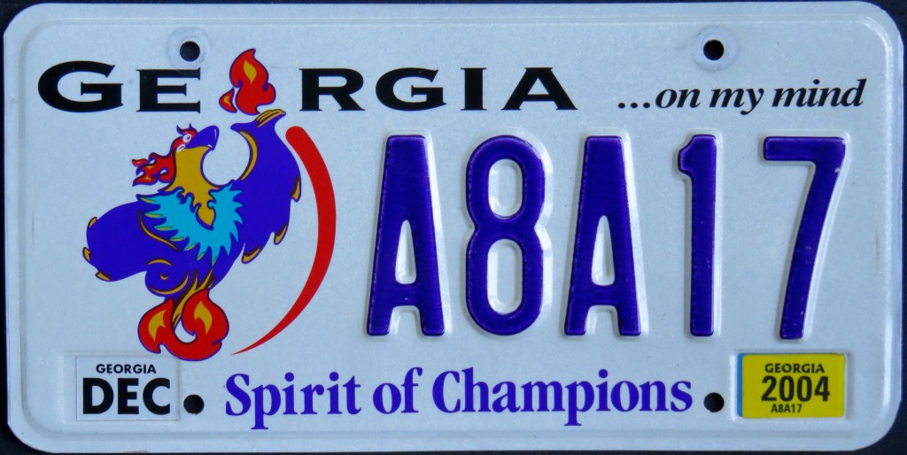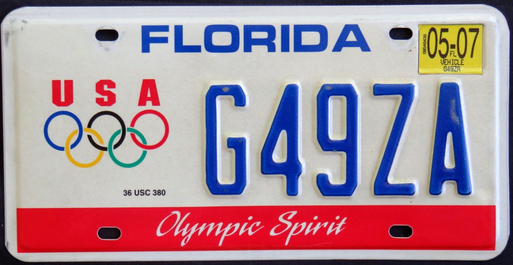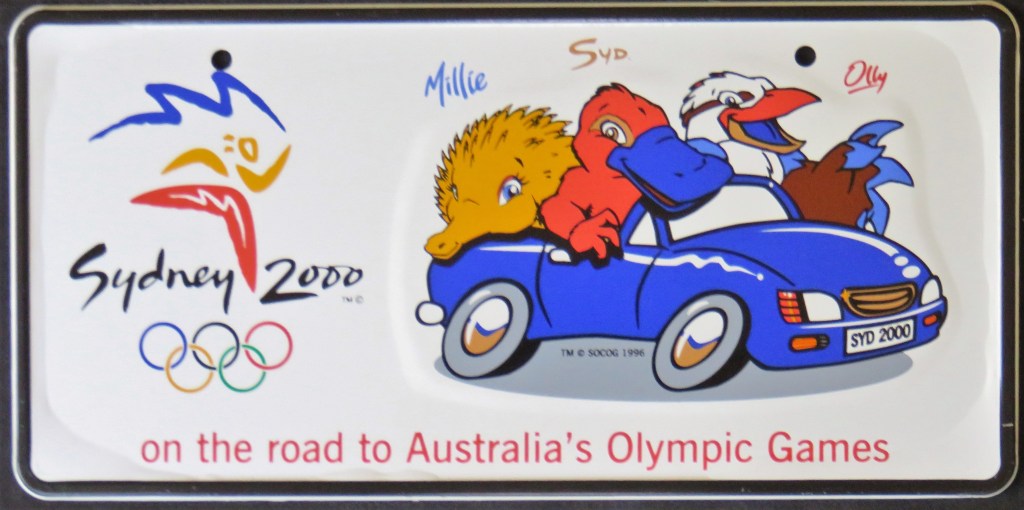 California issued a limited-run optional to honor the 1984 Olympic games which took place in Los Angeles. Florida‘s Olympic Spirit plate celebrates Olympics in general. Georgia issued the “Spirit of Champions” in connection with the Special Olympics. Utah, like California, had an optional when it hosted. One could order a souvenir plate from the 1988 Winter Olympics in Calgary with a personalized serial. The 2000 Summer Olympics souvenir plate features the mascots Olly (a kookaburra), Syd (a platypus), and Millie (an echidna).