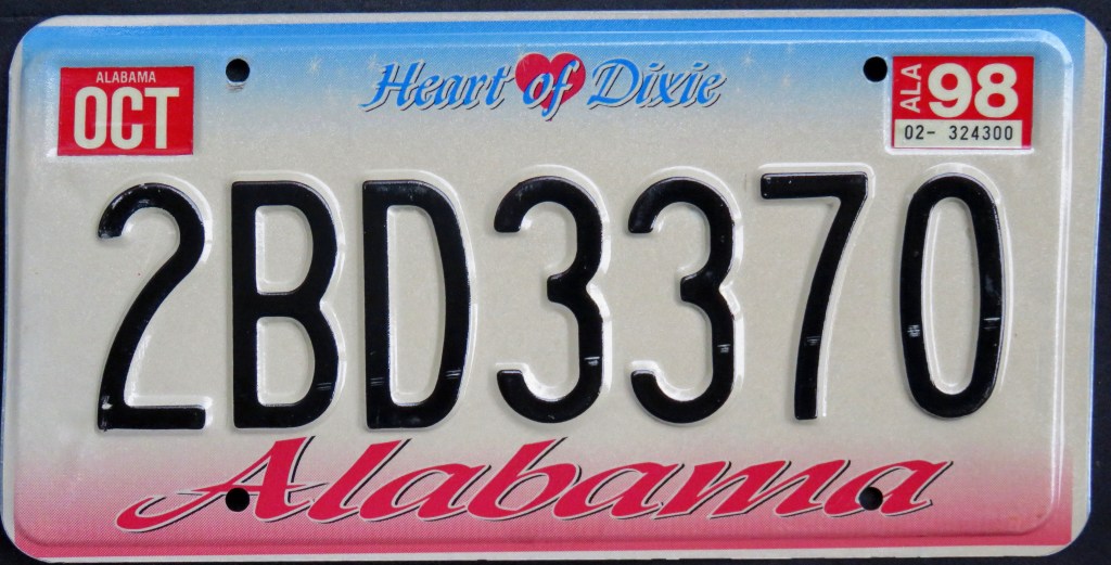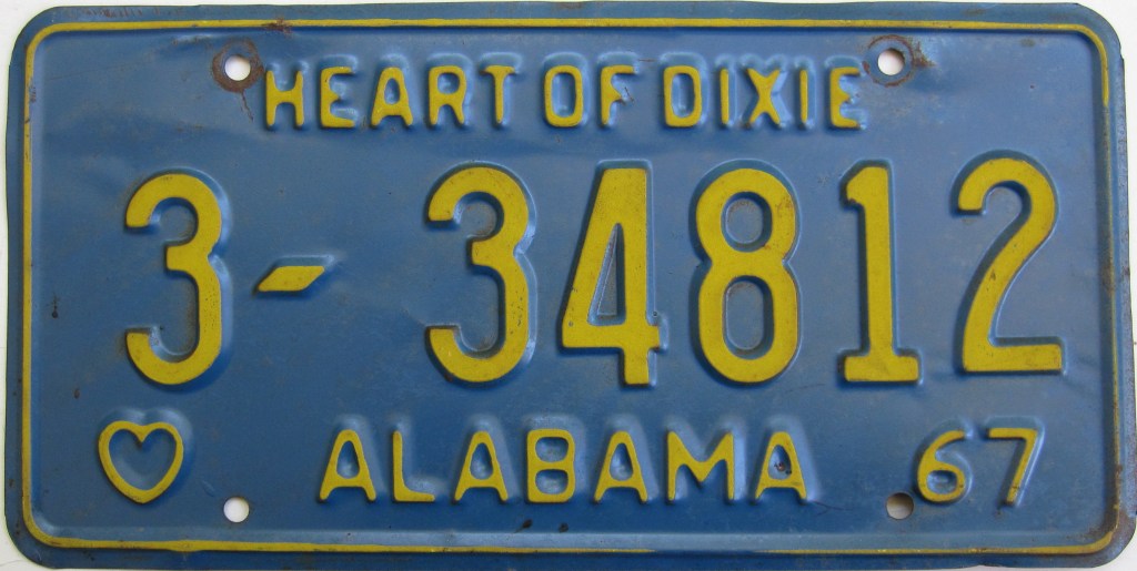 1967: This plate is part of a long-running format, with a heart graphic + ALABAMA + two-digit year on the bottom, and “HEART OF DIXIE” on the top.
