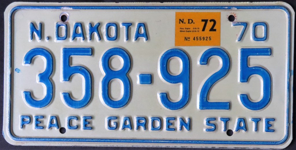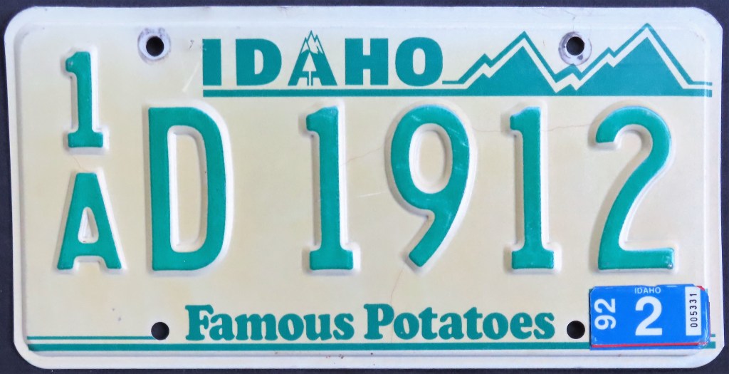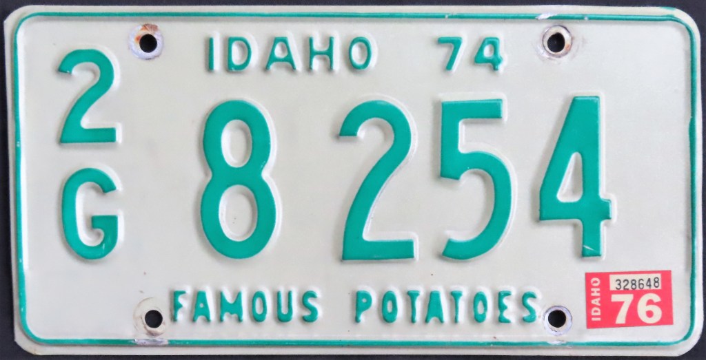 1957: The start of a more than two-decade stretch of plain white on green or green on white plates with the slogan “FAMOUS POTATOES.”