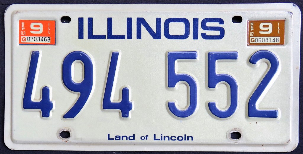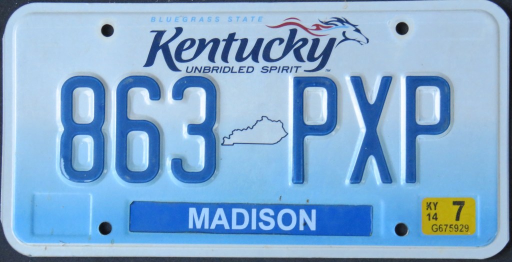 1982: The 1978 base’s unusual design has an elongated sticker box and the state abbreviation in the upper corners. In 1982 and 1983, the expiration sticker contains the slogan “BLUEGRASS STATE.”