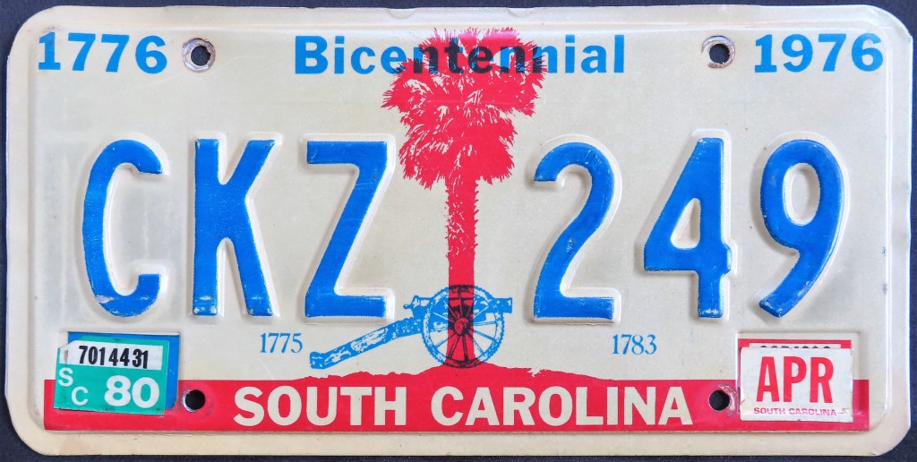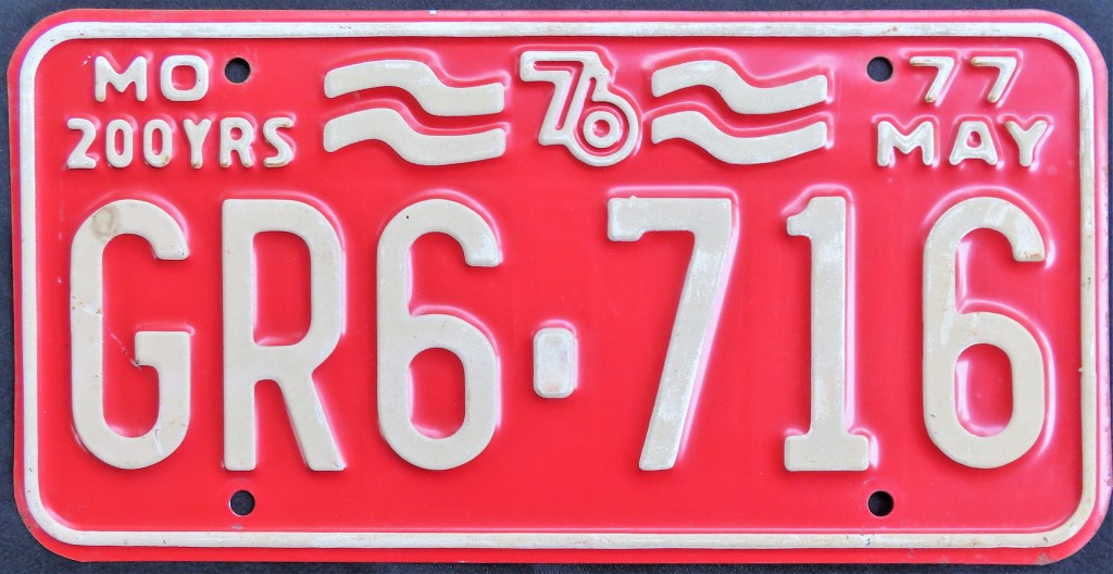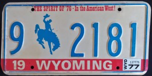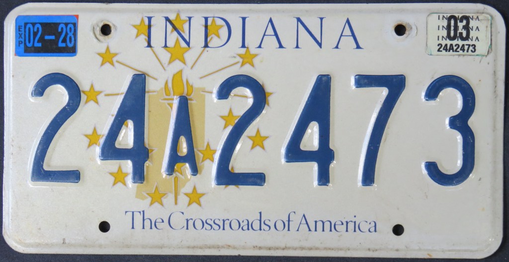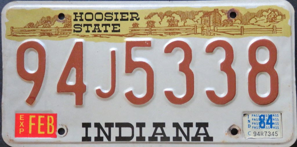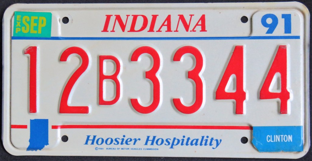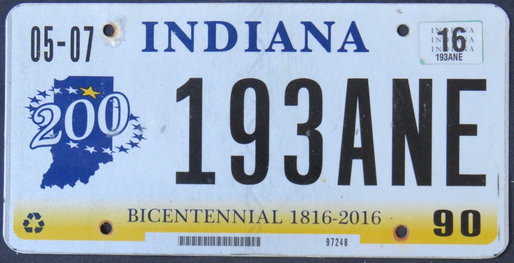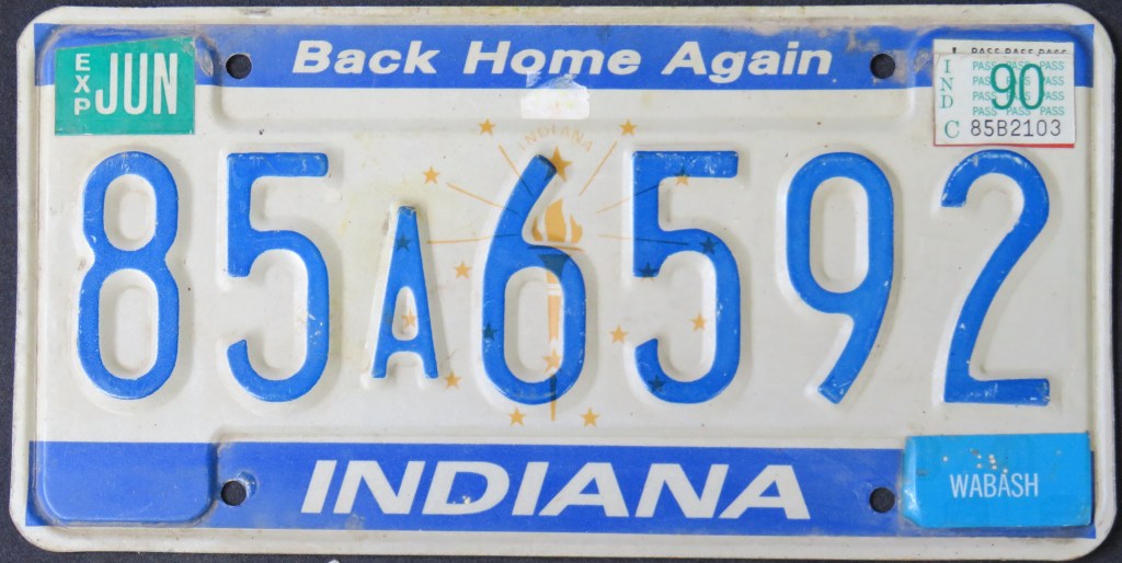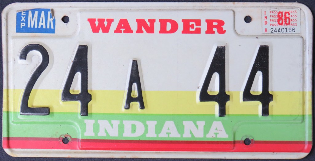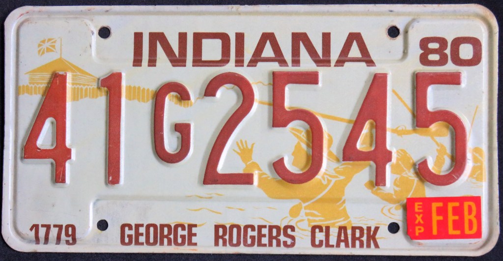 1976: The U.S. Bicentennial plate is the first in a series of plates with no repeating slogans. The Bicentennial of the George Rogers Clark expedition, the first and only use of the traditional “HOOSIER STATE” slogan, “WANDER” (the focus of a tourism campaign), and the state’s official motto, “The Crossroads of America,” are amongst the others.