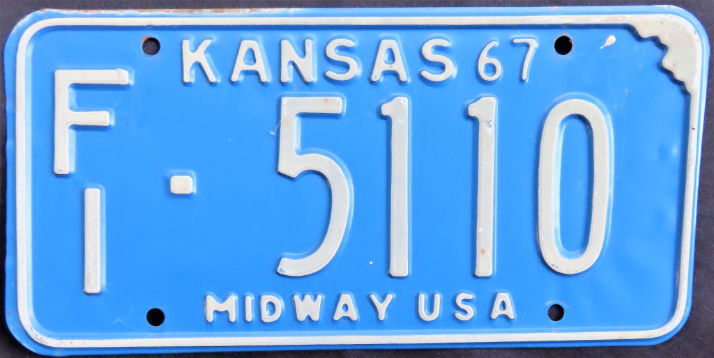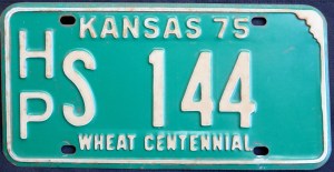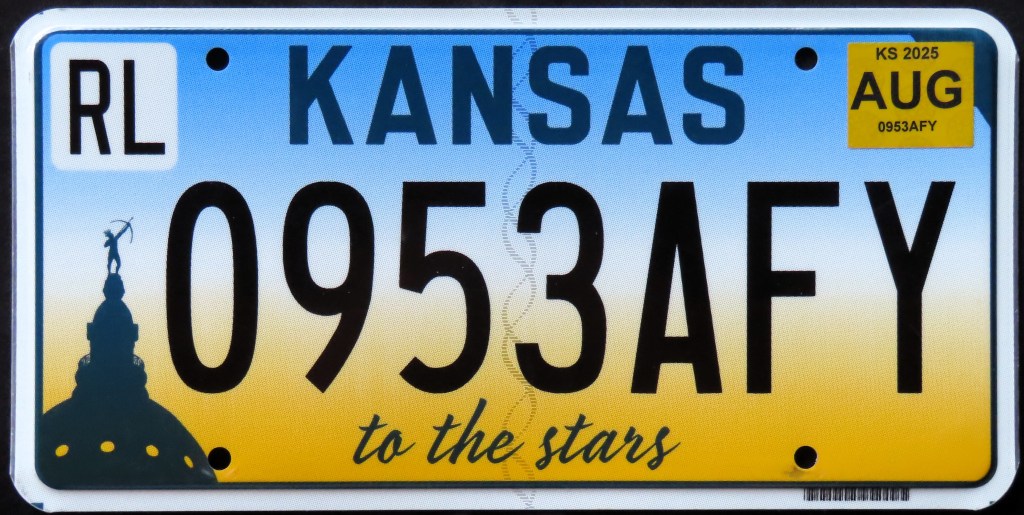 1975: Some issues from this year and the year prior have the slogan “WHEAT CENTENNIAL,” referring to the introduction of hard red winter wheat to the state. 2024: For the first time in just under 50 years, Kansas adds a slogan to its license plate. The slogan “to the stars” is the state’s newest tourism tagline, adopted in 2020 and based on the state motto Ad Astra Per Aspera, which translates to “to the stars through difficulty” and which appears in the background of the state’s previous base.