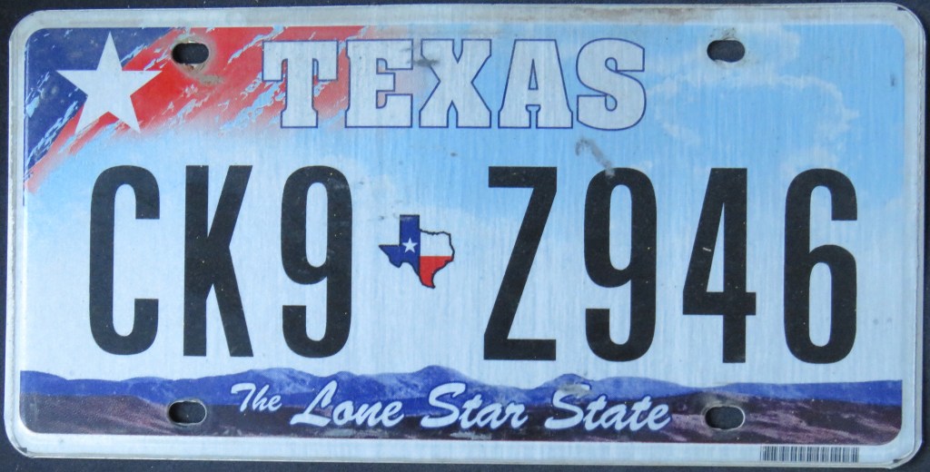 1985: The first of several red, white, and blue base plates notes the Sesquicentennial of the founding of the Republic of Texas (i.e., independence from Mexico) with the corresponding dates surrounding a mini-state map and the slogan “SESQUICENTENNIAL” on the bottom.