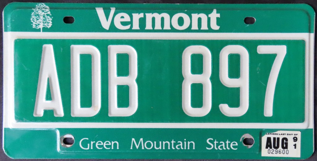 1985: The slogan is modified to “Green Mountain State” on a new base which is still on the roads today.