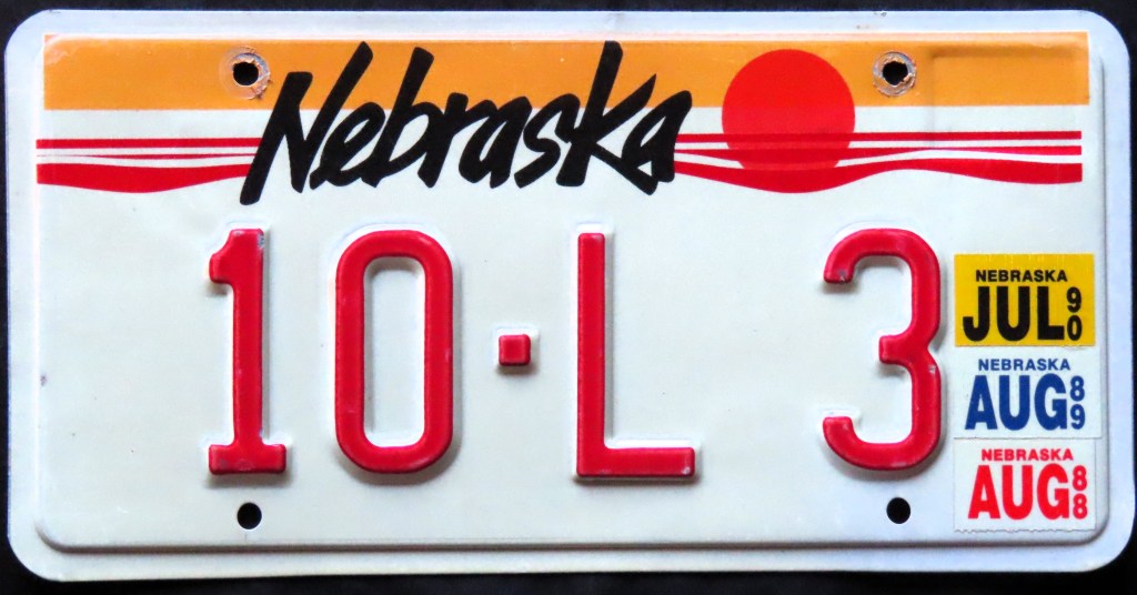 The plates above have stickers placed in multiple places – sometimes just an extra corner, other times all over – and everything in between.To multi-sticker or not multi-sticker…some states, particularly those in the east and in the 1970s, instructed motorists to place stickers in alternating corners. Not all followed the edict, or some did initially but as the years piled up strayed from the model.The Nebraska US Bicentennial base incorporated two small graphics in the upper corners and a wavy band, with dates in each corner, extending across the bottom. This left no room for revalidation stickers without having to sacrifice a graphic or a printed year. Some motorists found a way to preserve all the elements, while others made that bold choice. Another oddity with this base, which lasted through 1984, is that in 1982 the state issued only a month sticker (other years contained both the month and the year in the same sticker).